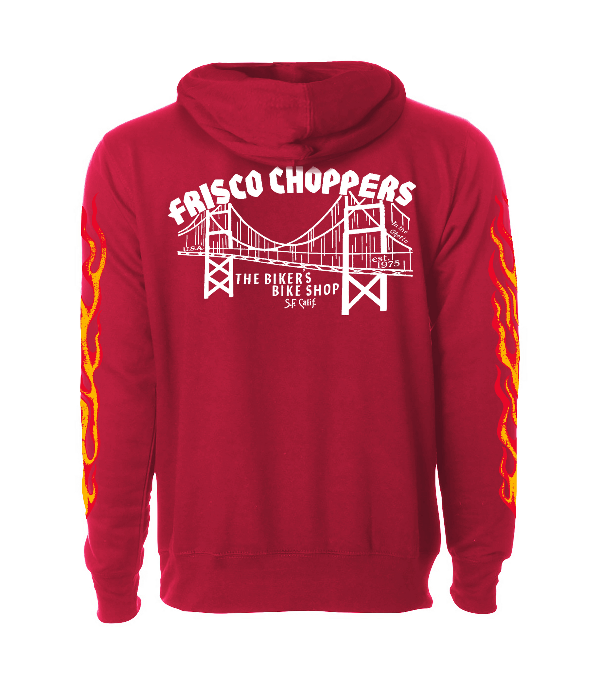 All new Frisco Choppers hoodies. Red cotton hoodie with with yellow and red motor logo.